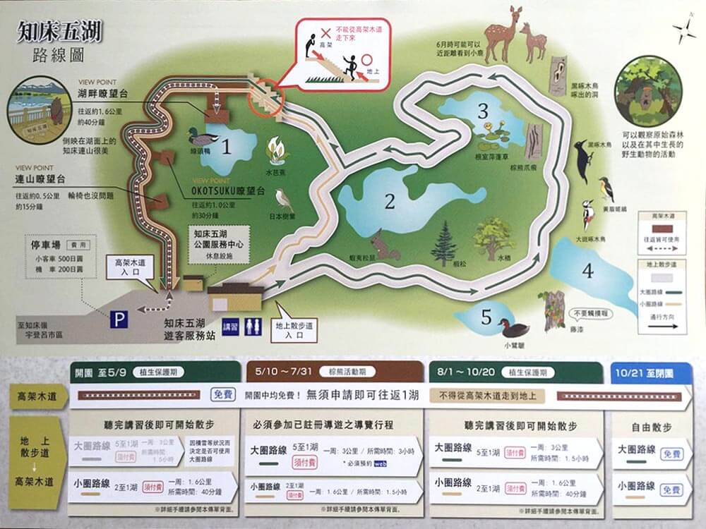 每年4月中旬起至11月中旬開放,而5至7月係棕熊活躍期,所以呢幾個月必須由嚮導帶領(預約詳情),其他日子就可以自己行。知床五湖行山徑