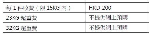 - 網上預購寄艙行李以每 1 件 15KG 計算,不設額外超重額。如行李超過 15KG,須於機場櫃檯繳交超重 費。