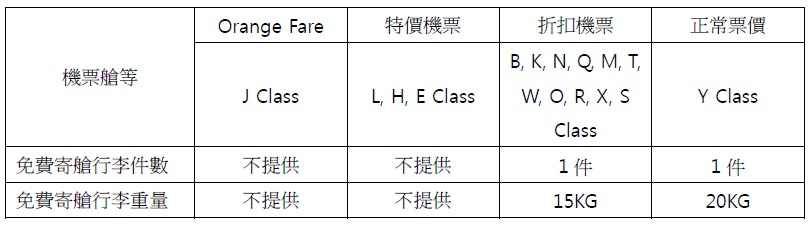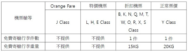 更改後:ORANGE FARE(J Class)維持不享有免費寄艙行李。「特價機票」(L, H, E Class)不享有 免費寄艙行李;「折扣機票」(B, K, N, Q, M, T, W, O, R, X, S Class)享有 1 件 15KG 免費寄艙行李;「正 常票價」(Y Class)享有 1 件 20KG 免費寄艙行李。