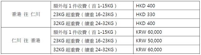 自 2016 年 5 月 1 日起,寄艙行李超重費將以段落式收費。以每 1 件行李獨立計算,首 15KG 為免費寄 艙行李(如乘客之機票艙等適用)。重量達到16KG而不多於23KG,將收取一個定額超重行李費。而該 行李重量達到 24KG 而不多於 32KG,將收取另一定額超重行李費。重量達 32KG 以上之寄艙行李,必須 分開打包。