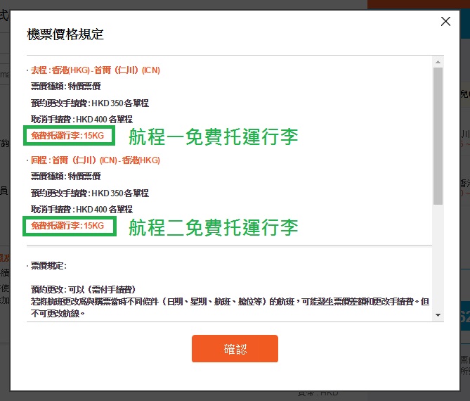 - Orange Fare、Lucky7等特價機票不包行李寄艙
