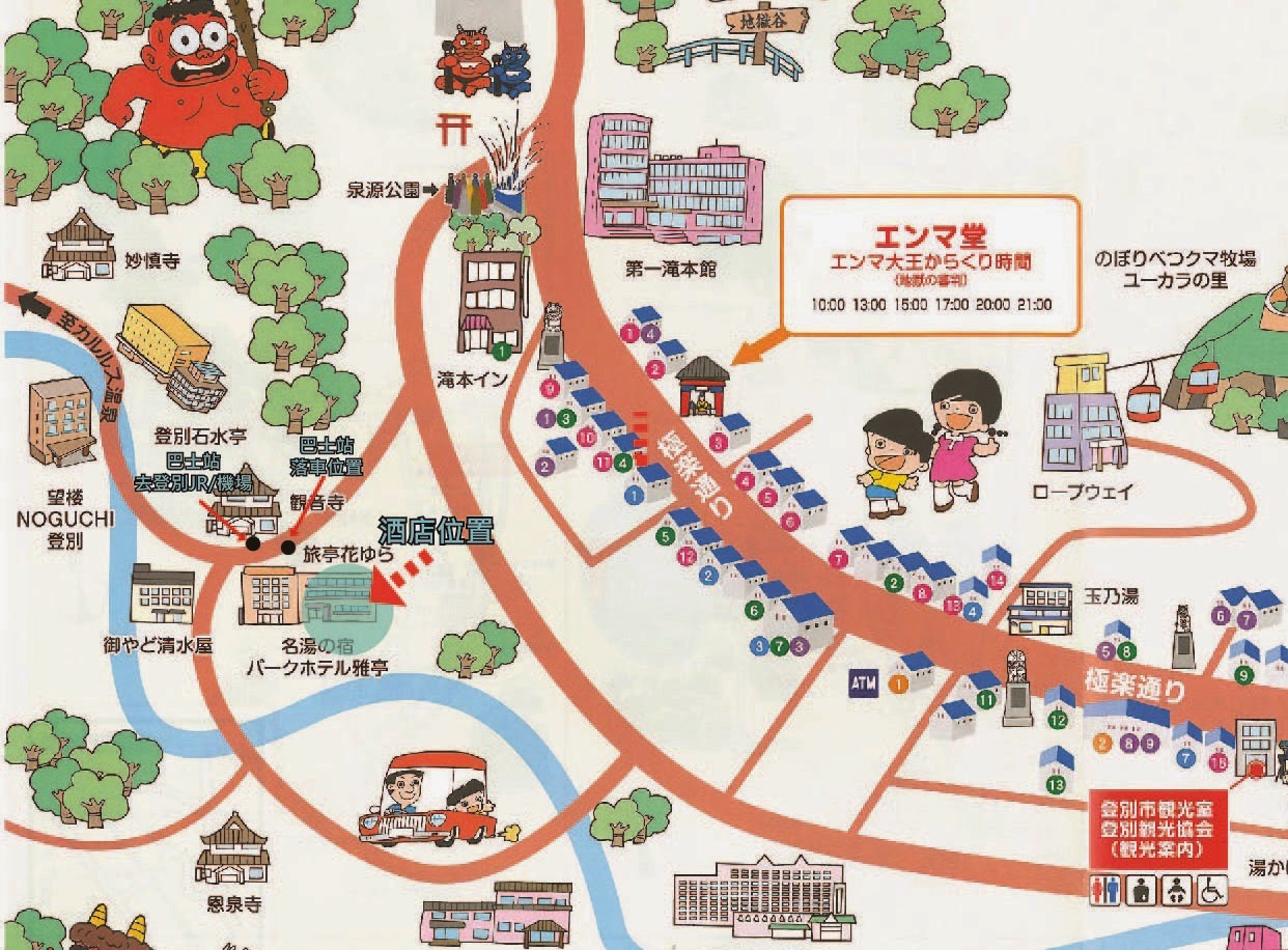 1. 新千歲機場的JR室蘭本線南千歲站,搭乘開往函館或室蘭的電車約40分鐘,在登別下車,從JR登別站乘坐前往登別溫泉方向的巴士約15分鐘。